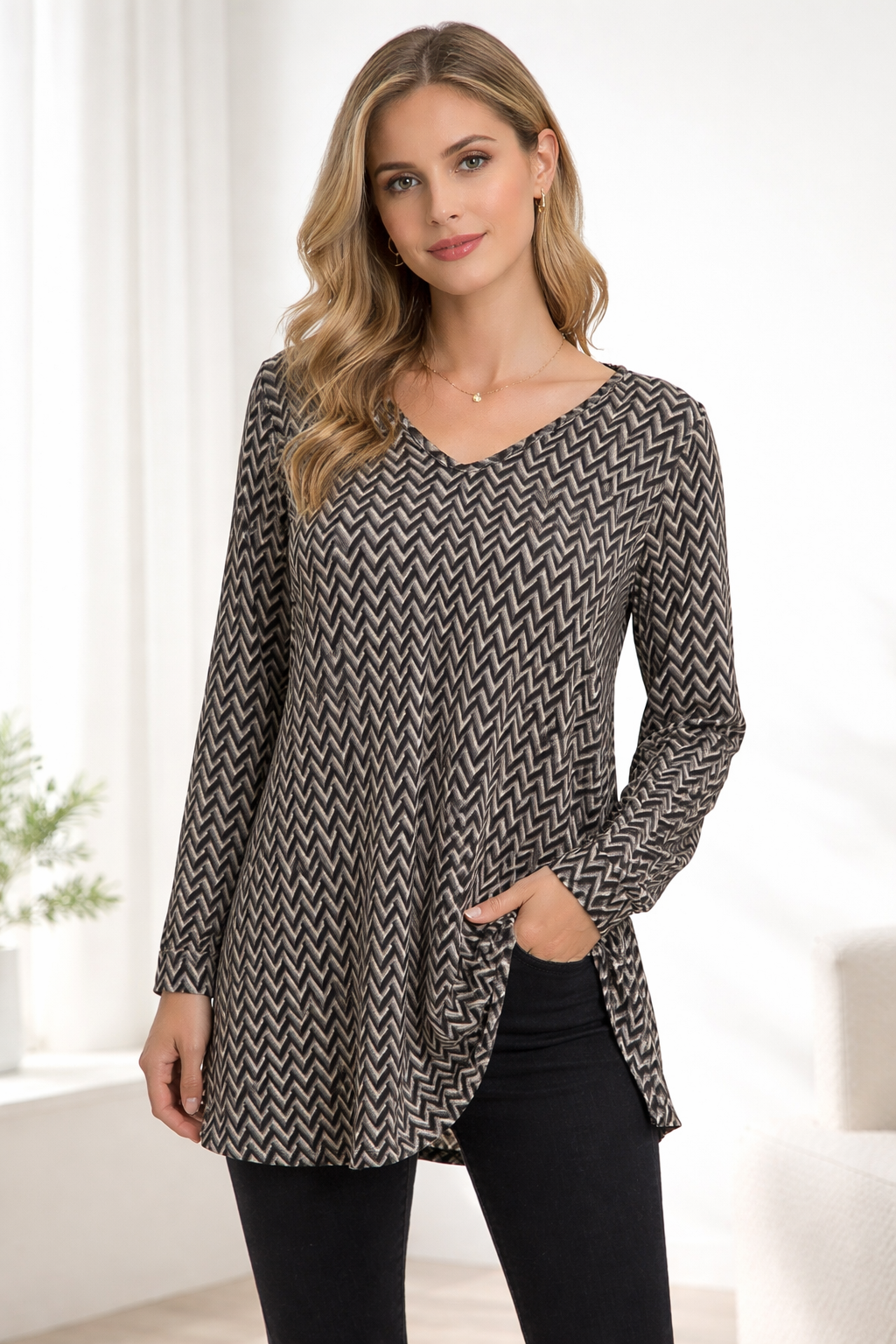Κομψή γυναικεία μπλούζα με μοντέρνο chevron σχέδιο σε γκρι και μαύρες αποχρώσεις. Διαθέτει άνετη γραμμή και κολακευτική V λαιμόκοψη, ιδανική για καθημερινές αλλά και πιο προσεγμένες εμφανίσεις. Το μαλακό και ελαφρύ ύφασμα προσφέρει άνεση όλη την ημέρα, ενώ το ιδιαίτερο σχέδιο δίνει στυλ σε κάθε σύνολο.