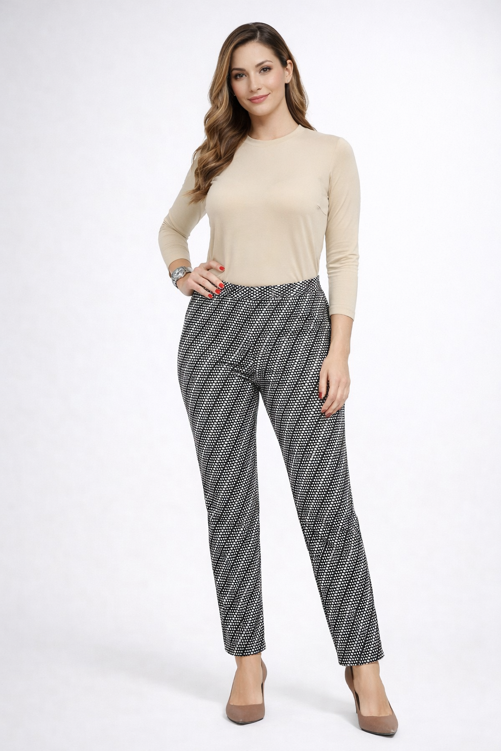 Κομψό παντελόνι με μοντέρνο ασπρόμαυρο print που δίνει ιδιαίτερο στυλ σε κάθε εμφάνιση. Διαθέτει ελαστική μέση για άνετη εφαρμογή και αγκαλιάζει όμορφα το σώμα, προσφέροντας άνεση όλη την ημέρα.
