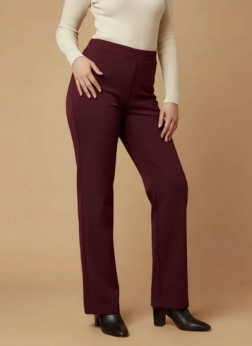 Ίσια/flat γραμμή για καθαρό, κομψό αποτέλεσμα. Ελαστικό κρεπ σκούμπα και λάστιχο στη μέση για άνεση όλη μέρα, ιδανικό για δουλειά και έξοδο.